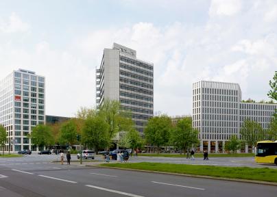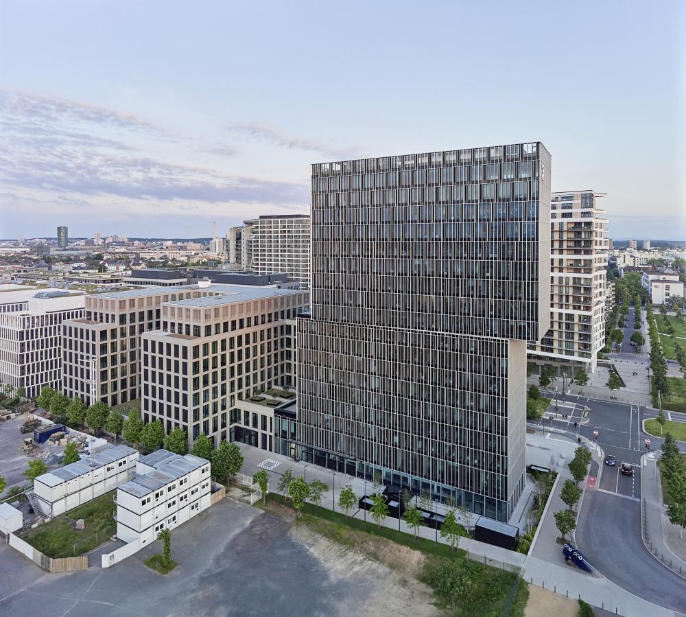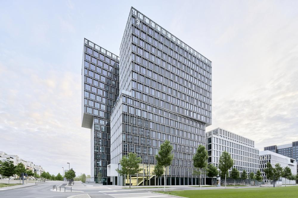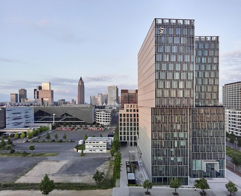 With their design for an office building on Europa-Allee, Eike Becker_Architekten won an international competition awarded by the city of Frankfurt. The aim was to create a building that would refer both to the Praedium residential tower across the street and to the Europa-Allee boulevard and surrounding Europapark district. This high-rise office building consists of two slender discs which are turned out of the axis and shifted against one another and provide a stylistic nod to the Praedium's lively design language. One half of the building points eastwards towards the skyscraper silhouette through the cantilever in the upper part, and the other faces west towards the Europagarten, thus symbolically connecting East and West. The building, which is an architectural commitment to the value of a unified Europe, will become the new headquarters of the Frankfurter Allgemeine Zeitung (F.A.Z). In the beginning of 2021, the F.A.Z. media company will move its approximately 1,000 employees from Frankfurt's Gallus district to the completed tower on Europa-Allee. Retail and gastronomy areas on the ground floor will underline the building's urban character and increase amenity values. The office tower is complemented by an eight-story hotel complex with 348 rooms.
