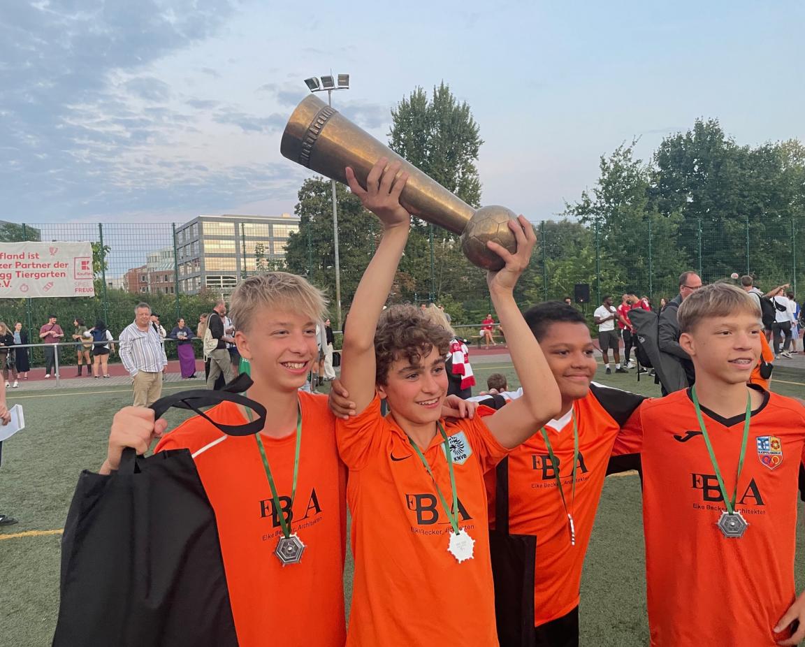 Die glücklichen Gewinner in den orangenen Trikots erhielten den Siegerpokal und werden im kommenden Jahr das Turnier ausrichten.