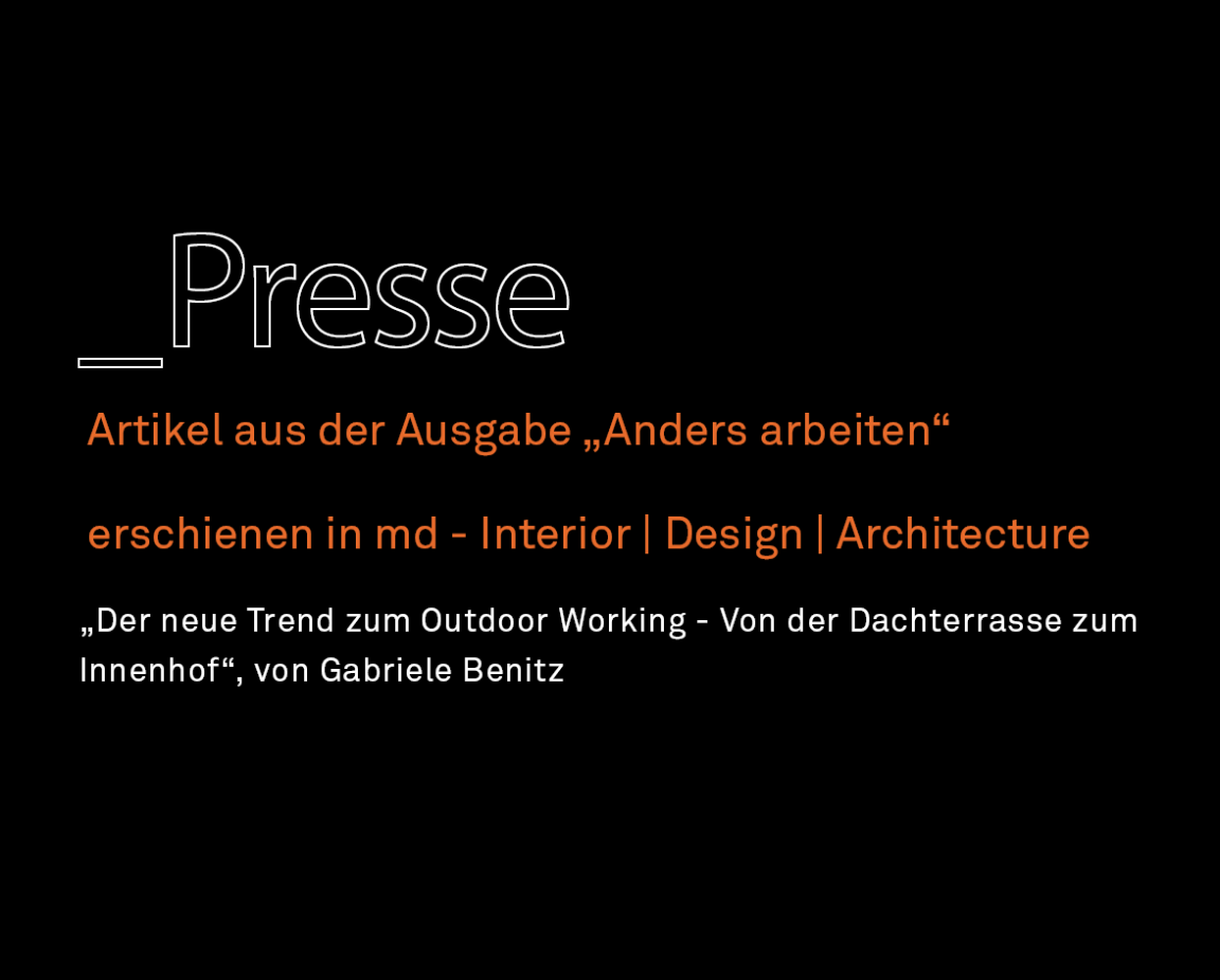 „Der Trend zum Outdoor Working zeichnet sich vor folgendem Hintergrund ab: Kunstlicht, kaum Naturbezug“, in dem Artikel von Gabriele Benitz über den neuen Trend zum Outdoor Working werden die Hintergründe, Vorbilder und Schattenseiten des Trends beleuchtet.