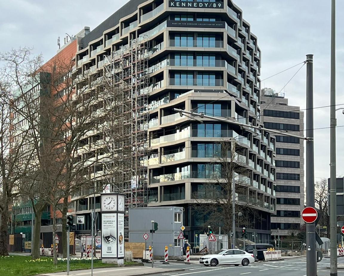 Der Fassadenbau des Kennedy 89, ein Hotel der Luxusklasse, welches an der Kreuzung Kennedyallee und Stresemannallee in Frankfurt am Main entsteht, ist fast abgeschlossen.