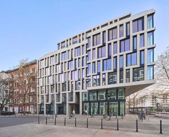 Besonders prägnant ist das 13-geschossige Bürohochhaus der IBB auf der gegenüberliegenden Straßenseite.