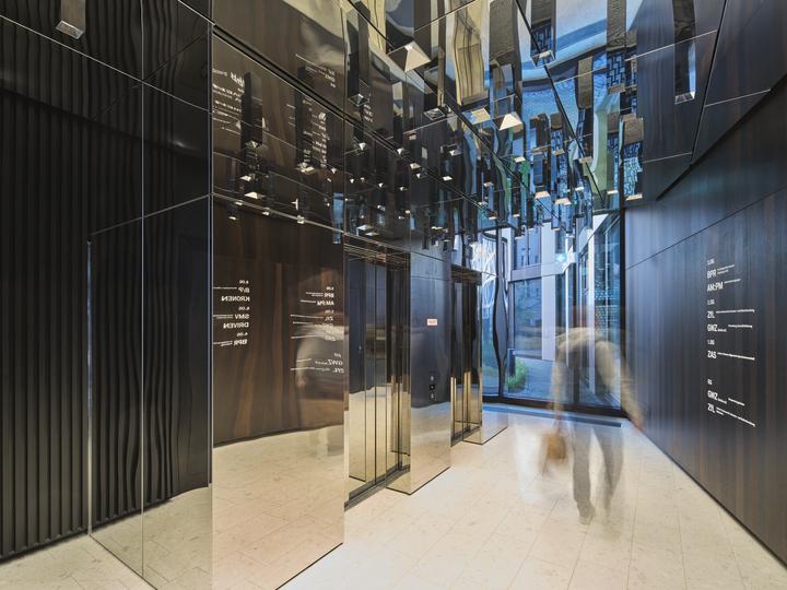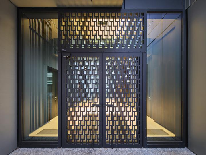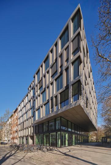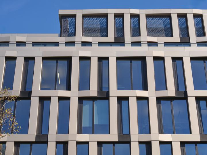 Die feingliedrige Fassade mit großzügigen Glasscheiben, Aluminiumprofilen und Formteilen aus Faserbeton gibt dem Gebäude eine einzigartige Erscheinung. Unterschiedlich tiefe, helle Lisenen erzeugen ein dynamisches Spiel aus Licht und Schatten. Die Fassade ist inspiriert von textilen Webmustern, die architektonisch neu interpretiert werden und die Struktur des Hause abwechslungsreich veranschaulichen.