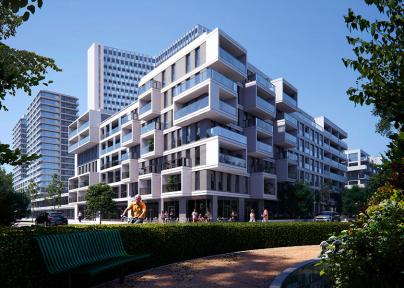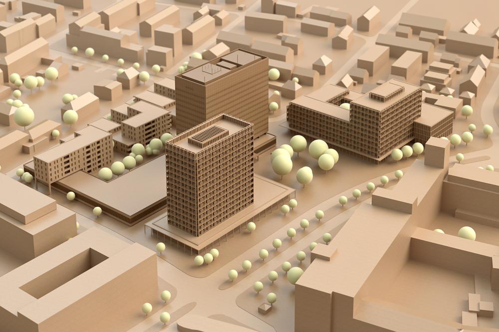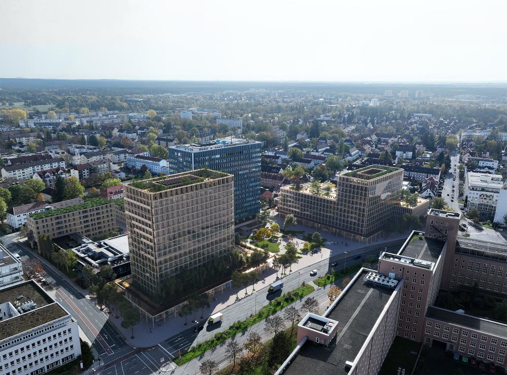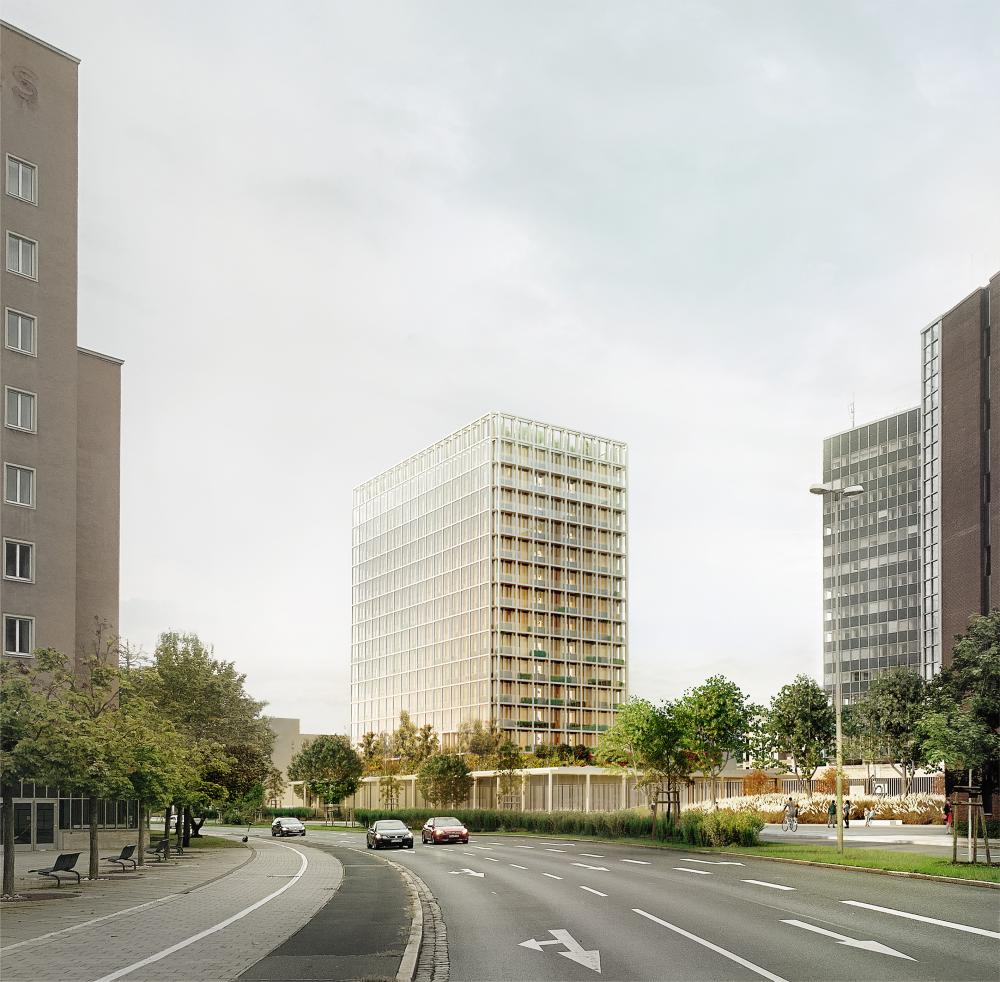 Der Entwurf sieht ein städtebauliches Ensemble vor, das die bestehende Hochhaus-Typologie mit liegenden und stehenden Scheiben aufgreift und durch ein neues Hochhaus ergänzt. Dieses wird so positioniert, dass Sichtachsen und Abstandsflächen gewahrt bleiben. Der zentrale „Rote Platz“ wird als grünes, soziales Herz des Quartiers neu gestaltet und durch Kolonnaden räumlich gefasst. Die Sockelzonen der Gebäude nehmen die Nachbarbebauung auf und schaffen Übergänge zur Straße und zum öffentlichen Raum. Das Konzept setzt auf eine klare Gliederung: Gewerbliche Nutzungen befinden sich im Erdgeschoss, darüber liegen barrierefreie Wohnungen, ergänzt durch gemeinschaftsbildende Freiräume und Dachgärten. Die modulare Bauweise in Holz-Beton-Hybrid ermöglicht kurze Bauzeiten und eine hohe Nachhaltigkeit. Begrünte Fassaden, PV-Anlagen und ein CO2-neutrales Energiekonzept unterstreichen den Anspruch an zukunftsfähige Architektur und Baukultur.