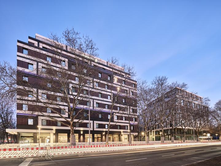 Besonders prägnant ist das 13-geschossige Bürohochhaus der IBB auf der gegenüberliegenden Straßenseite.