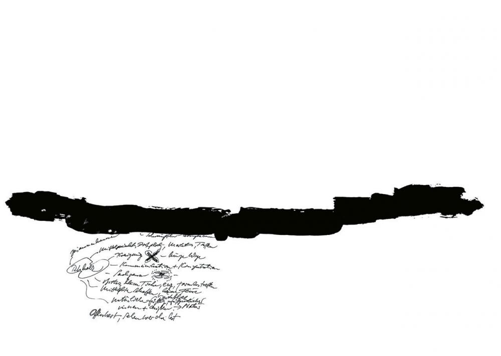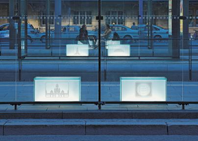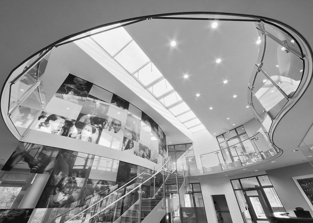 In der lichten Eingangshalle führt der Blick gleich in die Tiefe des Raumes, auf die Treppe in das Obergeschoss und auf die Glaswand mit den Fotos des Schweizer Künstlers Beat Streuli. Seine Tafeln mit den Porträts von Menschen aus aller Welt spiegeln sich nicht allein auf dem Boden, sondern auch auf der Biegung der Brüstung über dem Windfang wider. Hinter der Glaswand liegen ein Café und ein Restaurant, beide mit Zugang zur Terrasse im Gartenhof.