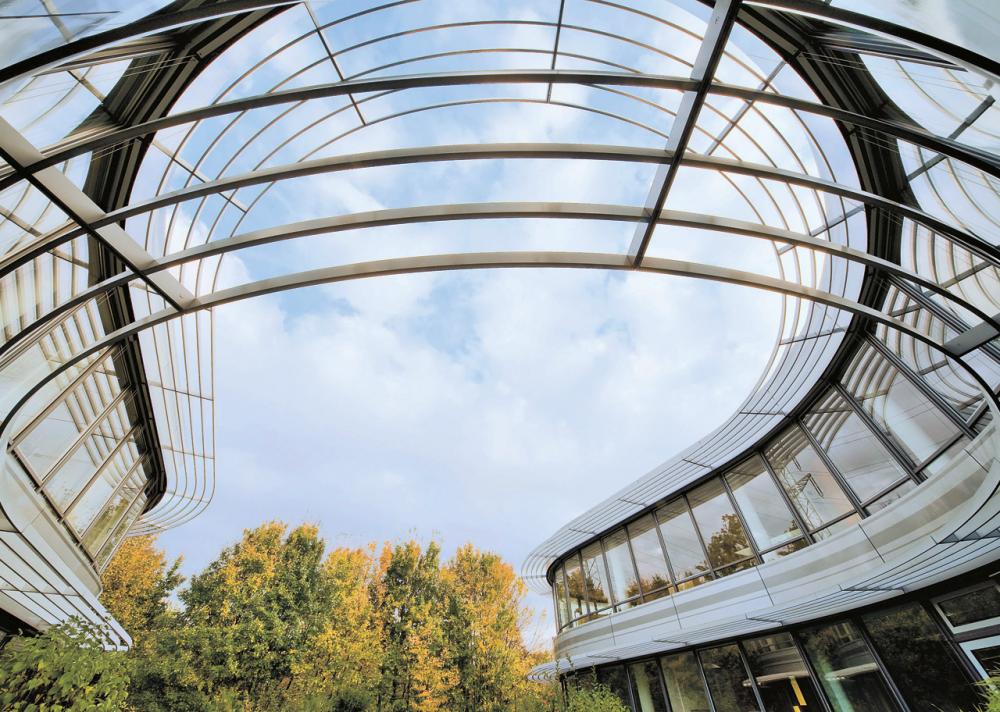 des Sonnenschutzes – beide aus mattem Aluminium – geben der Architektur etwas selten Homogenes. Und ihren vollen Schwung.