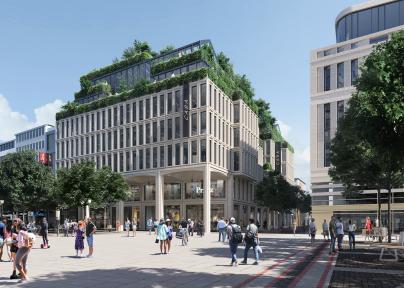 Der markante Baukörper ist elegant an der Straße der Pariser Kommune zurückgesetzt, wodurch ein öffentlicher Platz entsteht, der zum Verweilen einlädt.