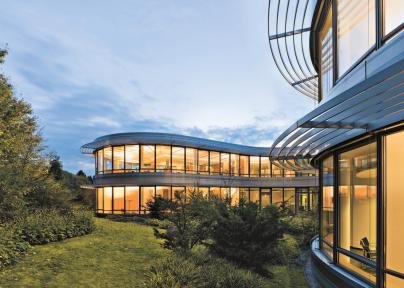 Ganz anders als der Riegel wirkt der Rundling. Bei flüchtiger Betrachtung ähnelt er einem Unknown Flying Object. Dabei ist es ein fester Körper, der auf achtzehn schrägen Stützen ruht und wie ein Schiff aus bis zu 3 Meter hohen Spanten aus Stahl gebaut wurde. In mancher Hinsicht ähnlich wie die Längen- und Breitengrade auf einem Globus, bilden diese Spanten ein Trag- und Fachwerk mit über achtzig Einzelfeldern.