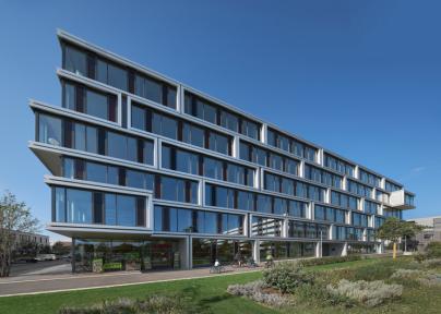 Der mit hellen Latten waagrecht verkleidete, allseits so gut wie geschlossene Riegel hat eine Länge von 50 Metern und eine Breite von 12 Metern. Er dient – unter dem Motto »Medien für Menschen« – der Präsentation des Unternehmens Bertelsmann. Im Erdgeschoss finden sich ein Medienladen und ein Restaurant; im ersten und zweiten Obergeschoss breitet sich eine Ausstellung über die Aktivität des Global Player Bertelsmann aus; im dritten Obergeschoss des kantigen Gebäudes liegen Tagungsräume.