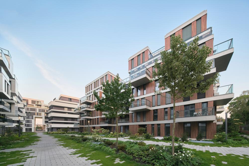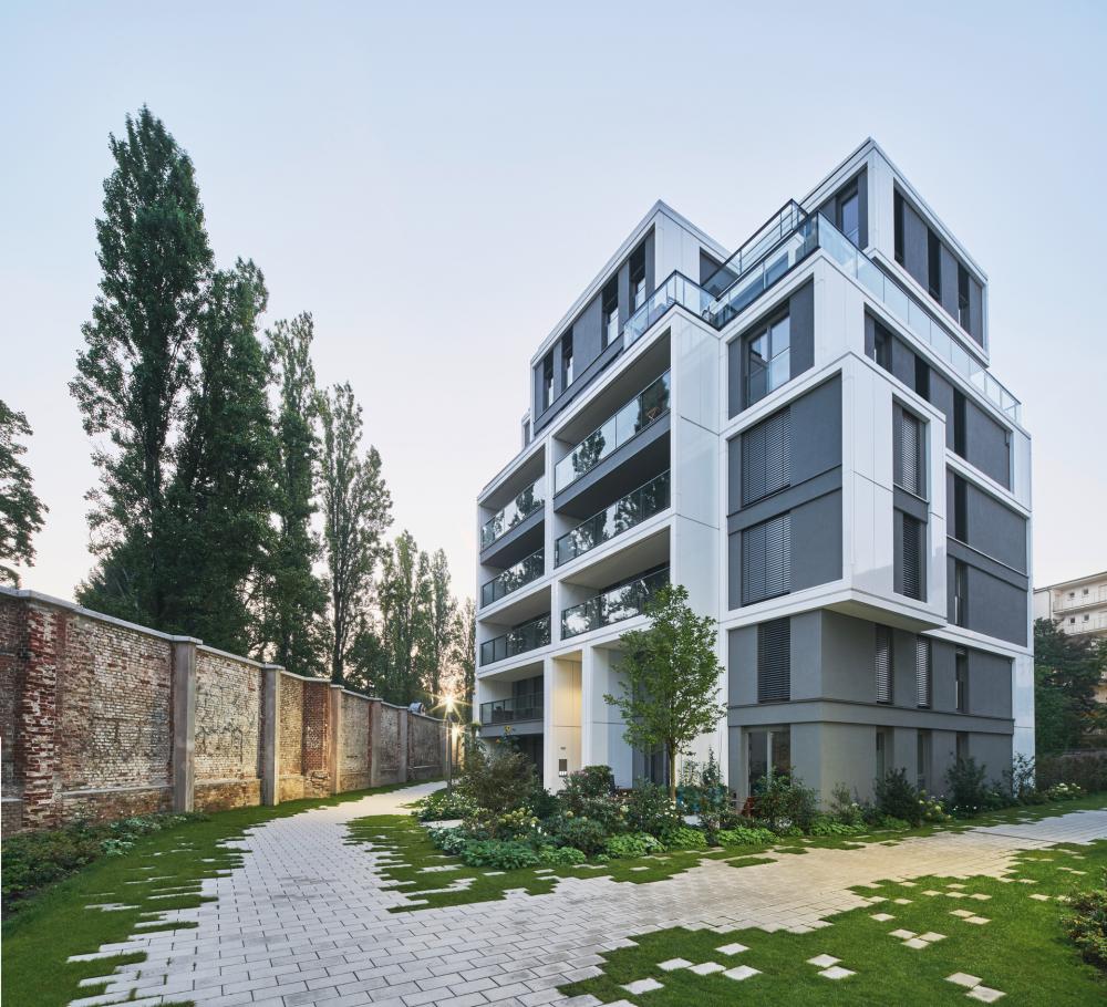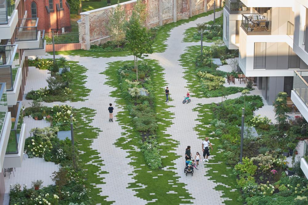An der Chausseestraße, wo einst die Grenze zwischen Ost- und West-Berlin verlief, hebt das grüne Gebäude-Ensemble von Eike Becker_Architekten die Grenzen zwischen Stadt und Land scheinbar auf. Der Entwurf überträgt die Idee der Berliner Hofgärten aus dem 19. Jahrhundert in die Moderne. Als Vorbilder dienten Riehmers Hofgarten in Kreuzberg und der Amalienpark in Pankow. Das Ergebnis ist eine ruhige grüne Wohn-Oase inmitten der pulsierenden Großstadt. Balkone, Terrassen, Kleingärten und eine außergewöhnliche Freiraumgestaltung setzen der urbanen Hektik eine Gartenidylle entgegen, in der sich die Hauptstadt wie ein nie enden wollender Sonntag auf dem Land anfühlt. Dass der Garten auf verblüffende Weise weiträumig und großzügig wirkt, liegt vor allem daran, dass ein Friedhof auf der Rückseite den im Hof angelegten Grünzug fortsetzt und mit seiner pittoresken Kapelle eine einzigartige Sichtachse bildet. Umschlossen wird das innerstädtische Gartenidyll von moderner Architektur. 16 individuelle Häuser, deren Fassaden in ihrer Materialität und Farbigkeit ganz unterschiedlich sind, machen jedes Einzelgebäude zu einem Unikat.