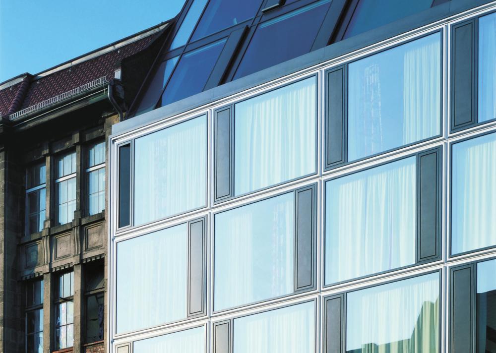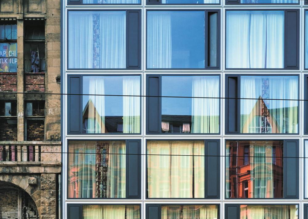 Die gläserne Stirnseite, das heißt die Fassade, macht den Gast einerseits zum Voyeur, anderseits zum Objekt des Alltags an der Mündung von Oranienburger Straße und Linienstraße. Pro Hotelzimmer erscheint eine feste Scheibe von 2,7 mal 2,7 Metern, neben ihr eine öffenbare Klappe von 0,5 Metern Breite. Die Öffnungsflügel sind, wie die Rahmen der Fenster, aus Aluminium; doch sind sie mit einer matten, anthrazitfarbenen Schicht versehen. Und sie springen – sowohl von Geschoss zu Geschoss als auch von Zimmer zu Zimmer – immer wieder von rechts nach links, von links nach rechts.