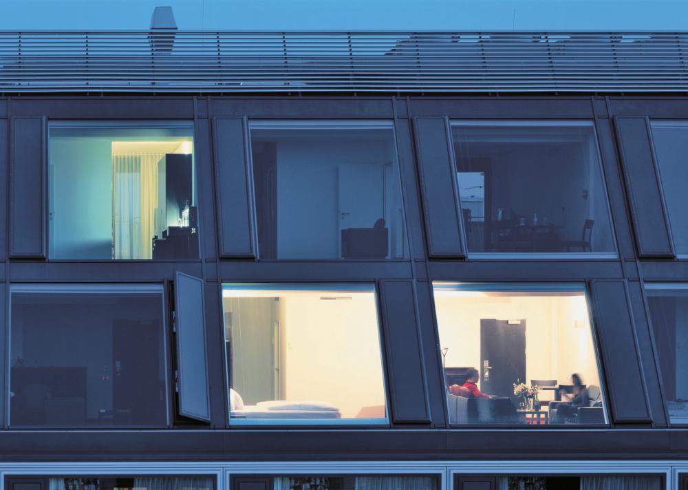 Vordach und Eingang, beide gläsern und farbig hinterleuchtet, nehmen beinahe den Charakter eines Baldachins an. Die Lobby, die Rezeption, die Bar zur Rechten und das Restaurant zur Linken – dieses auch von der Straße zu betreten – bieten dank ihrer Höhe von immerhin fast zwei Geschossen den Eindruck von großer Fülle des Raums. Auf den Normalgeschossen liegen jeweils links und rechts eines Korridors zusammen fünfundsiebzig Zimmer. Ihre Einrichtung ist schlicht in den Formen, stark in den Farben. In den beiden Dachgeschossen finden sich zusammen zehn Suiten von je knapp 50 Quadratmetern. Hier neigt sich die gläserne Stirnseite des Gebäudes um 60 Grad und geht bruchlos in das Schrägdach über.