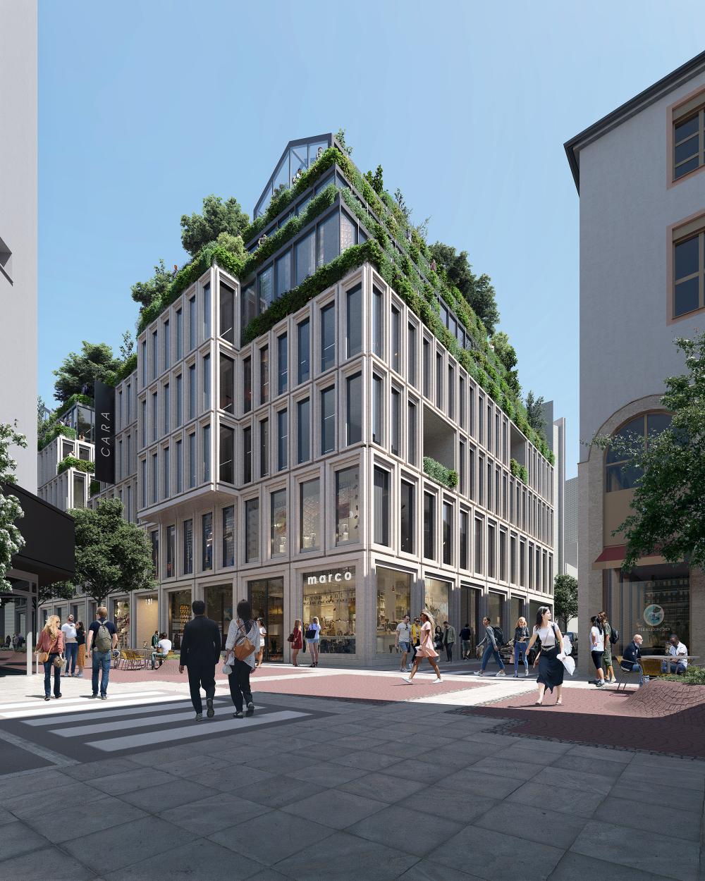 Die umfangreiche Verwendung der vorhandenen Bausubstanz, der Neubau im Wesentlichen in Holzbauweise, das Bergdorf oben auf dem Dach, die Loggia Arkade an der Zeil, die eine einzigartige Handelsadresse markiert und ein terrassiertes Tal nach Westen, dass natürliches Tageslicht und durch Pflanzen verbesserte Luft wie ein Trichter bis tief in das Gebäudeinnere leitet, machen zusammen einen Handels- und Arbeitsort, der eine hohe Lebensqualität bietet.